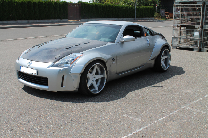 An diesem 350Z haben wir einige Modifikationen vorgenommen. Der Z bekam eine Seibon Carbonhaube mit passenden Aerocatches sowie einen Seibon Heckdeckel. Nachdem wir die Anpassungsarbeiten und Trennarbeiten vorgenommen hatten konnten wir das Stardast Overfender-Kit montieren. Gleichzeitig wurden Japspeed Verstrebungen und Querlenker verbaut. Die Ansaugung wurde modifiziert sowie der Sturz angepasst. Alle Umbauten wurden über uns eingetragen. In Zukunft wird es eine Änderung des Designs geben sowie ein Airride Fahrwerk – Ebenfalls ist ein Turbo Umbau geplant sowie ein Upgrade der Bremsanlage!